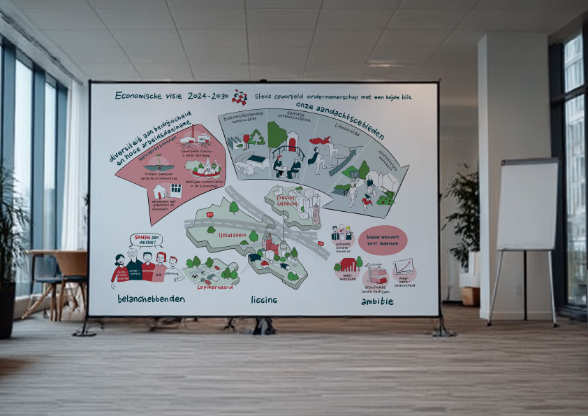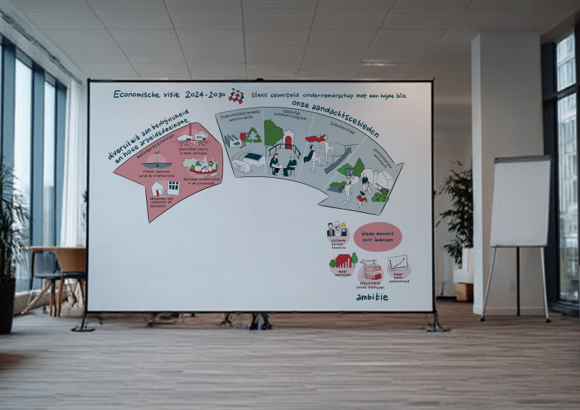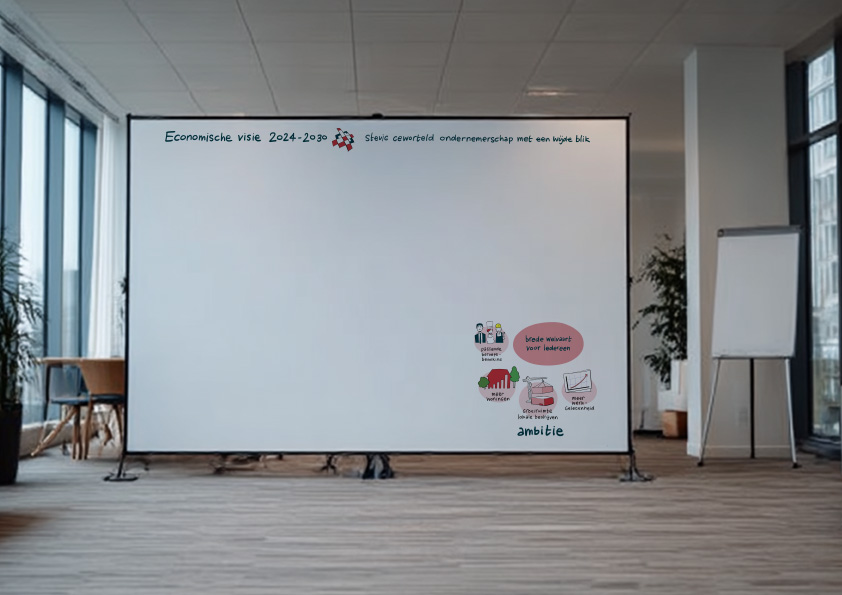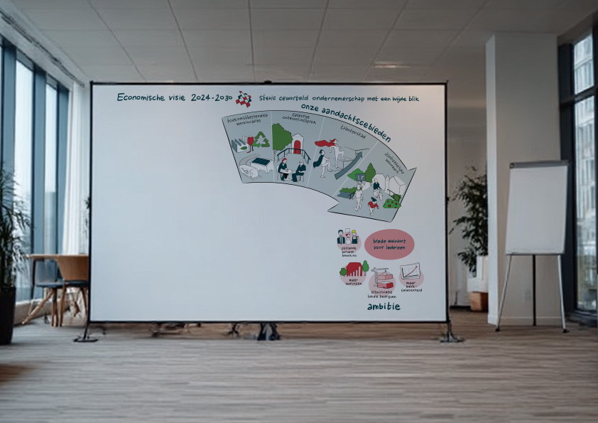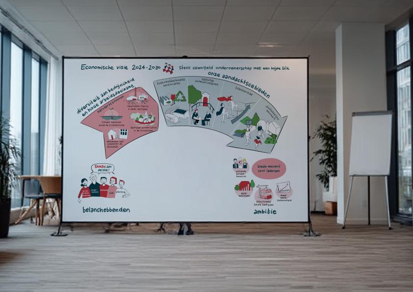 We maken Powerpoint- of Canva-slides waarin de praatplaat wordt opgebouwd. Je kunt je publiek dan stap-voor-stap meenemen door je verhaal.