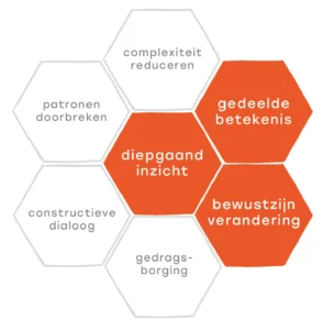 Elke interventie heeft een duidelijk doel, werkwijze en een verwacht resultaat. Sommige zijn bedoeld om de onderstroom zichtbaar te maken. Andere helpen om een gedeeld verhaal te bouwen, patronen te doorbreken of gedrag te borgen.